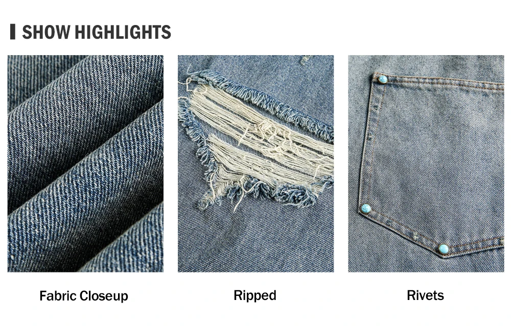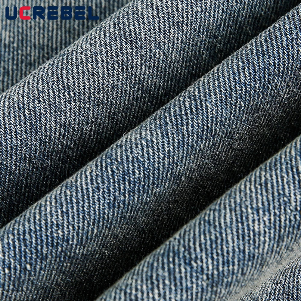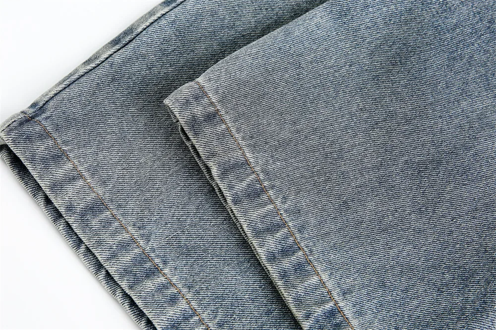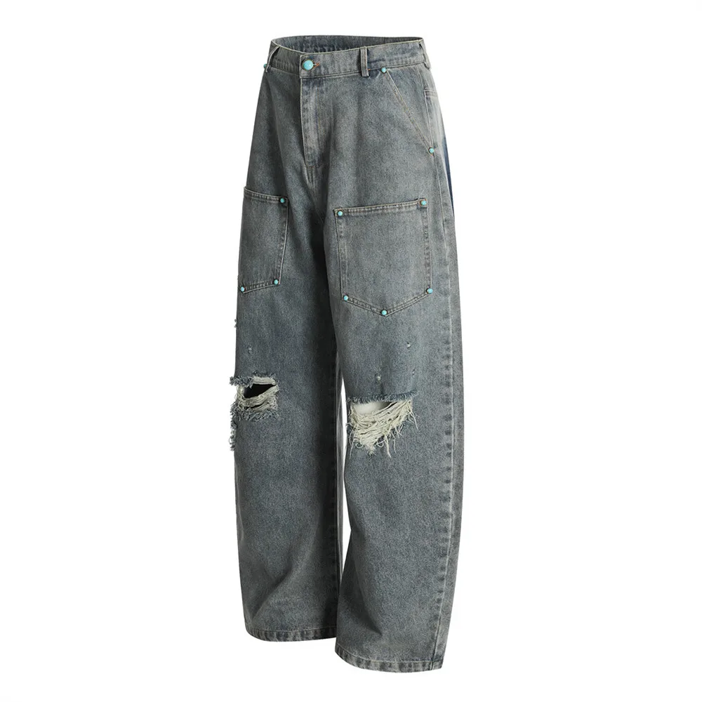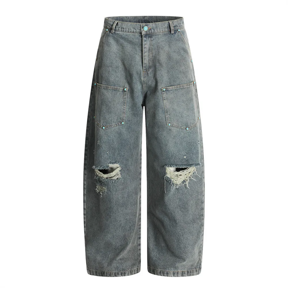 Ripped Jeans Mens With Rivets Pocket Retro High Street Washed Distressed Loose Wide leg Denim Pants Men